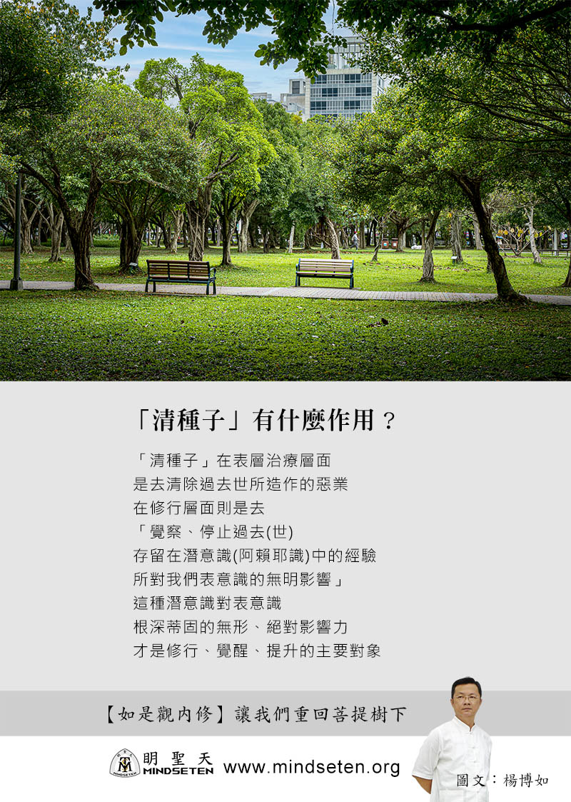 【「清種子」有什麼作用?】「清種子」在表層治療層面是去清除過去世所造作的惡業在修行層面則是去「覺察、停止過去(世)存留在潛意識(阿賴耶識)中的經驗所對我們表意識的無明影響」這種潛意識對表意識根深蒂固的無形、絕對影響力才是修行、覺醒、提升的主要對象【如是觀內修】讓我們重回菩提樹下www.mindseten.org